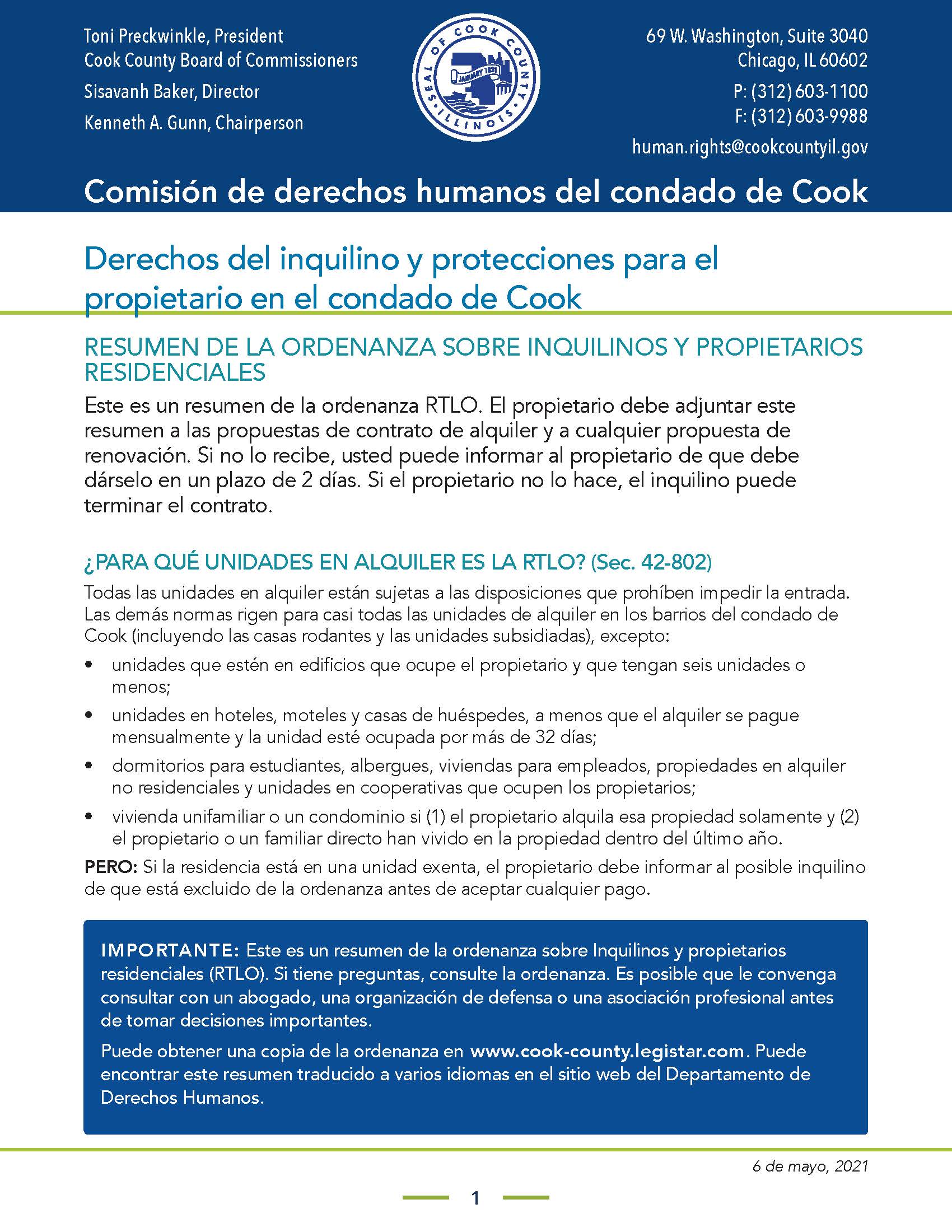 Summary of Residential Tenant Landlord Ordinance (Spanish)